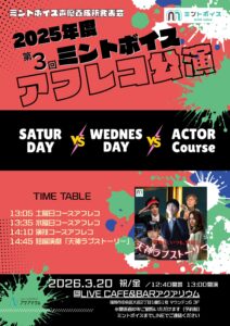 今年も開催!ミントボイス声優養成所主催のアフレコ公演😄アフレコ・歌・演劇など1年間のレッスンの成果を発表いたします✨今年は3チームが対戦!27名が出演します!みんな頑張ってレッスンしております✊関係者の皆様のご来場をお待 […]